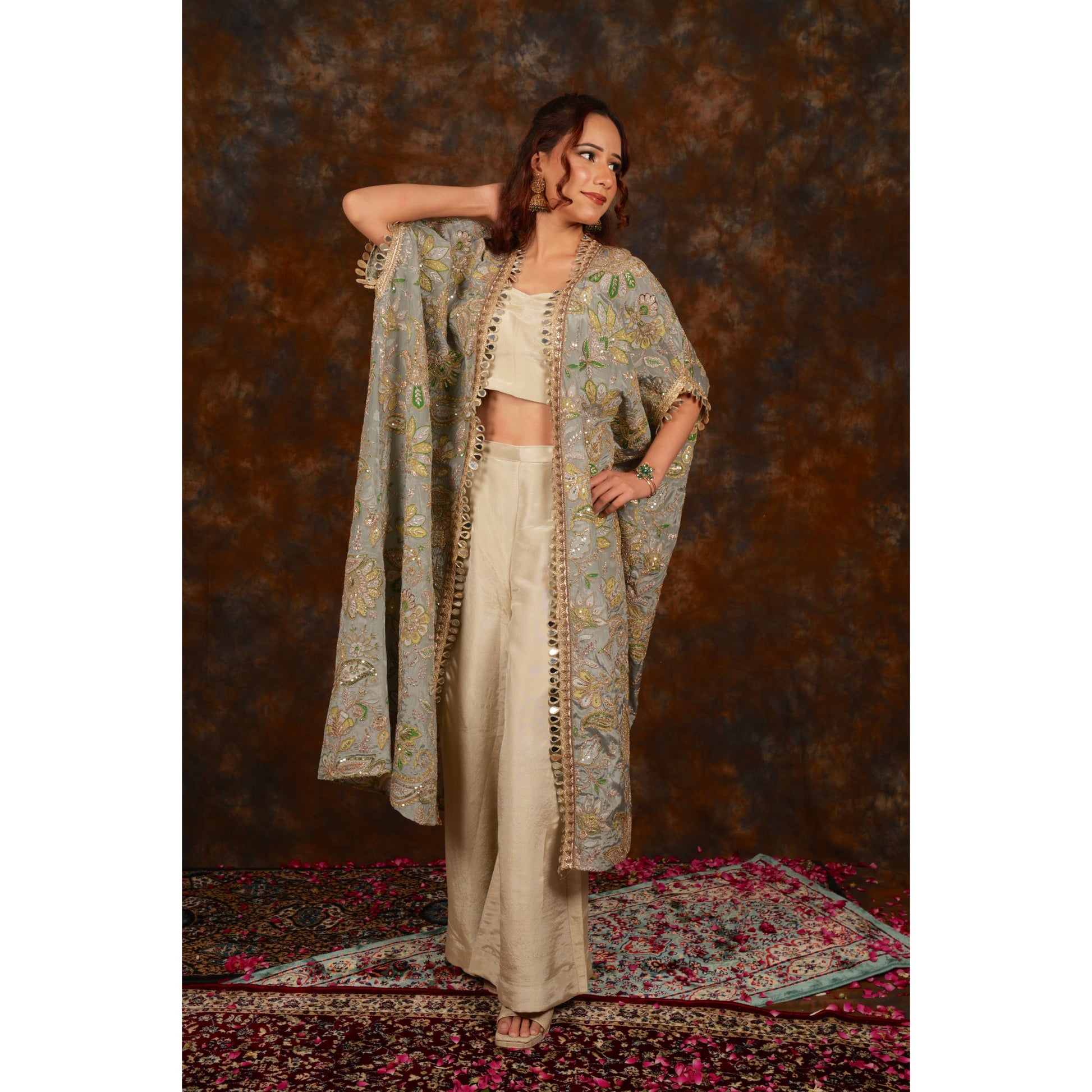 Afsana Grey is a beautifully crafted free-size kimono shrug designed for effortless elegance. Made from soft crepe fabric, it features delicate floral motifs highlighted with zari and sequin embroidery, giving it a refined festive charm. Lightweight, flowy, and versatile — it enhances any outfit with a touch of regal sophistication.