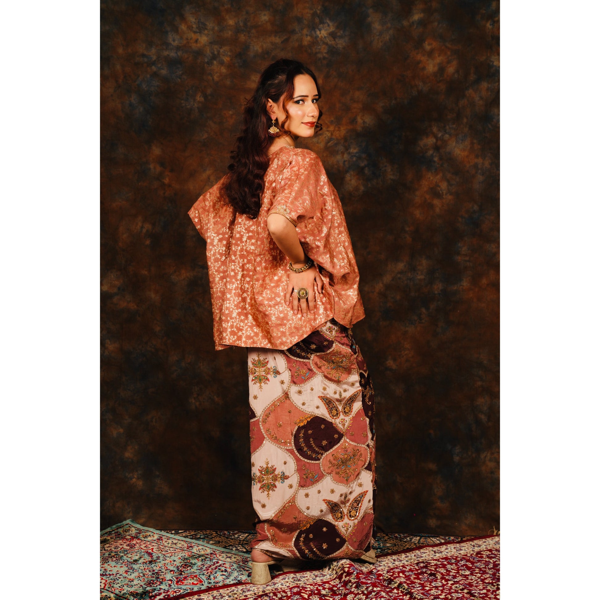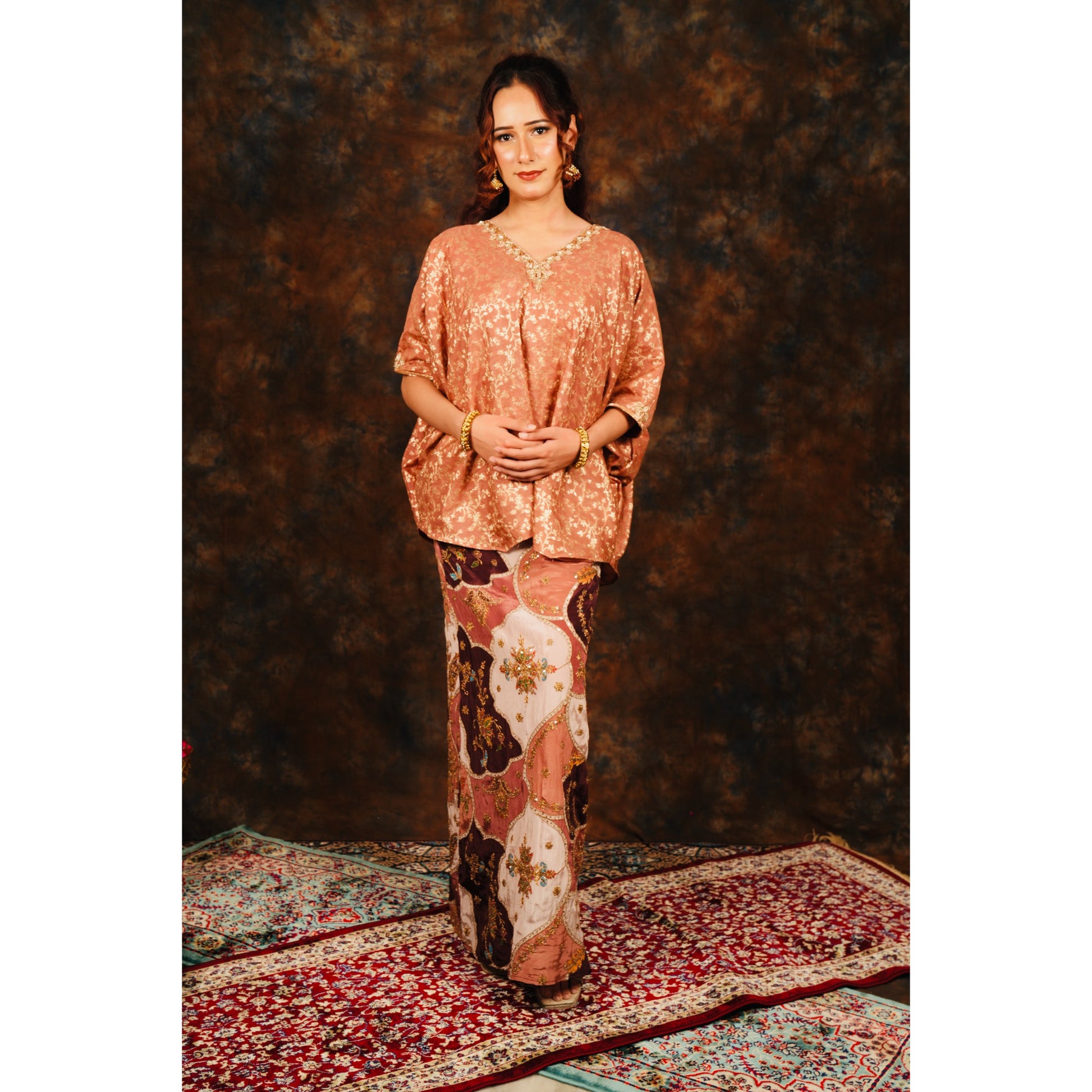 A rose-gold velvet kaftan paired with an embellished printed skirt, blending effortless grace with timeless elegance.
