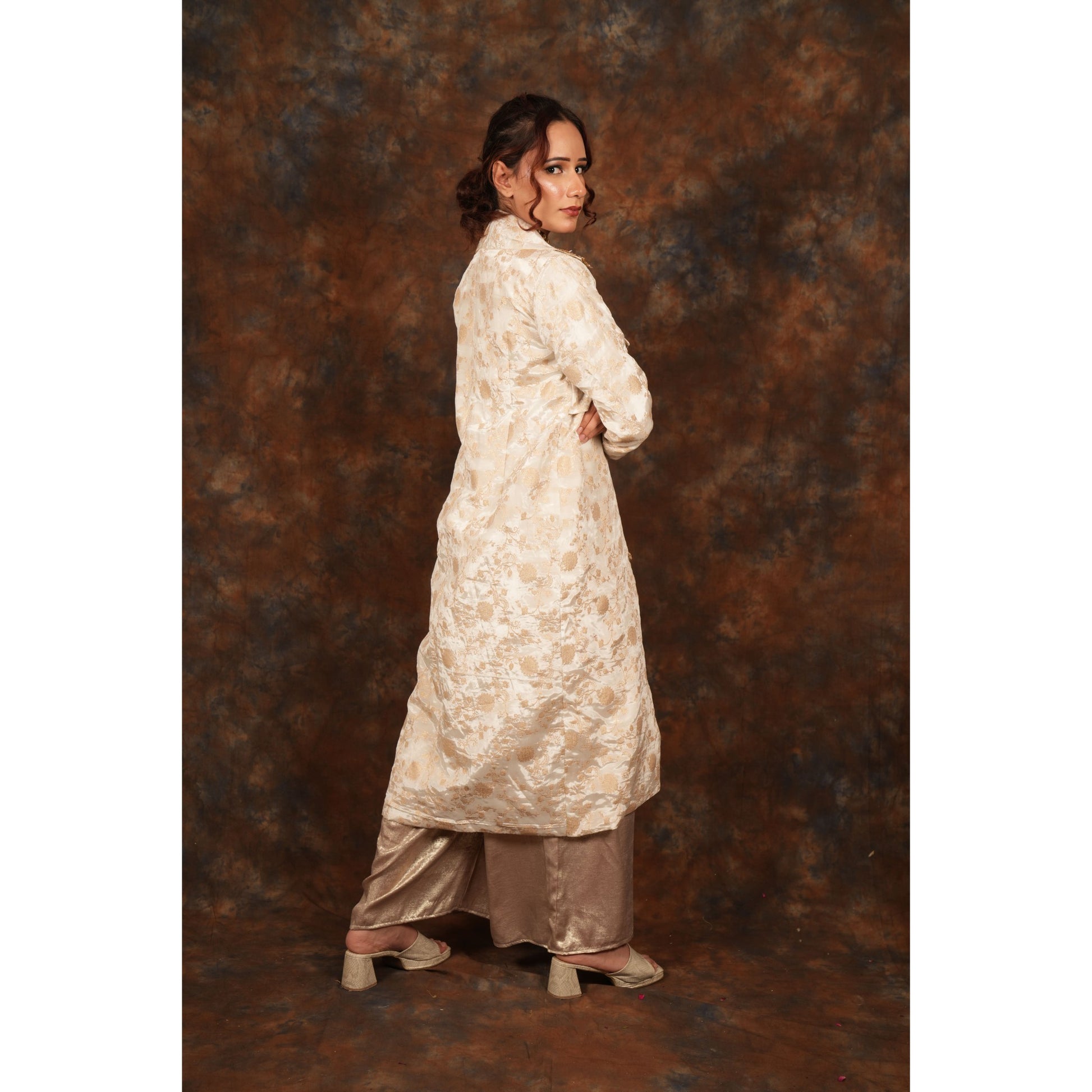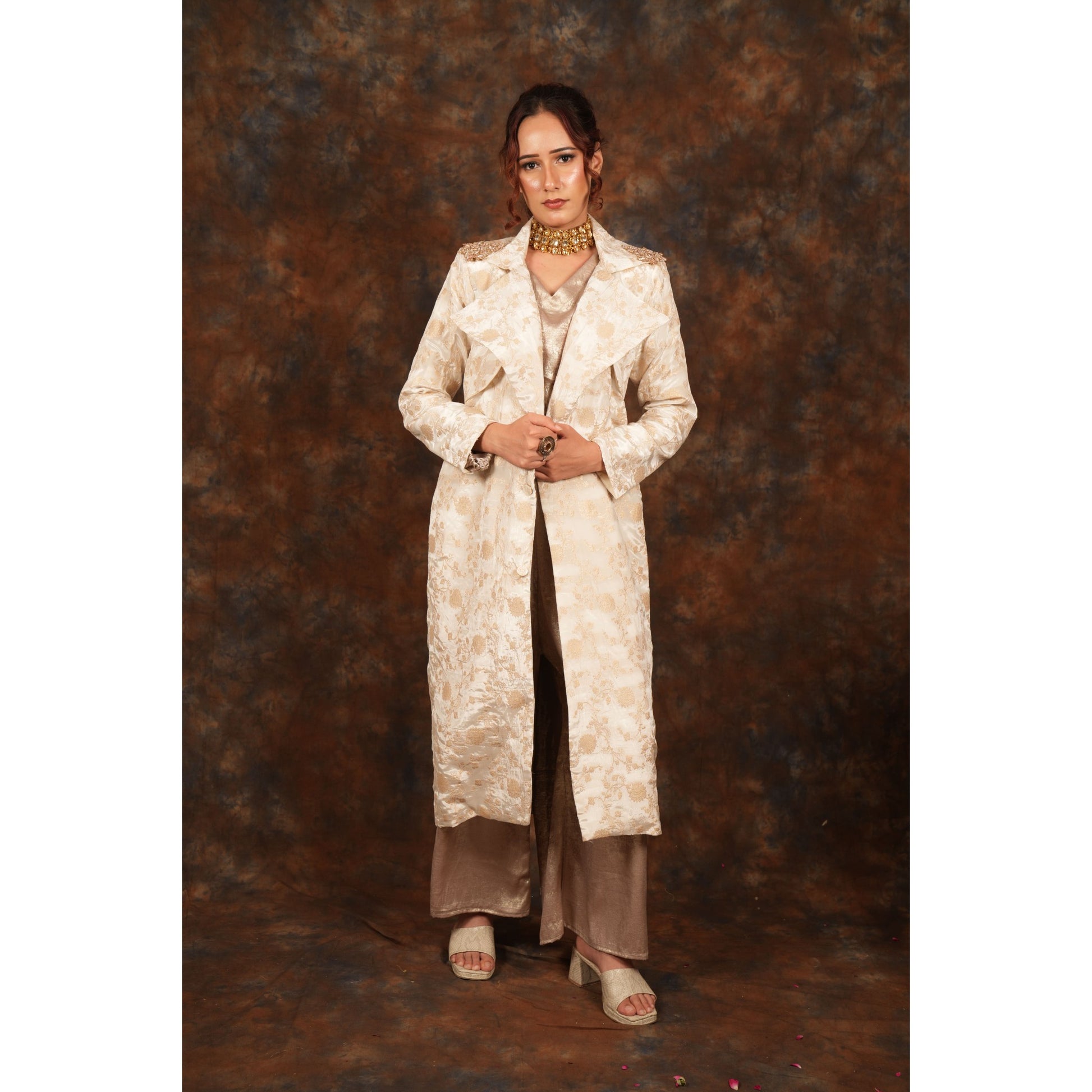 A long ivory trench coat blending structured finesse with radiant allure.
