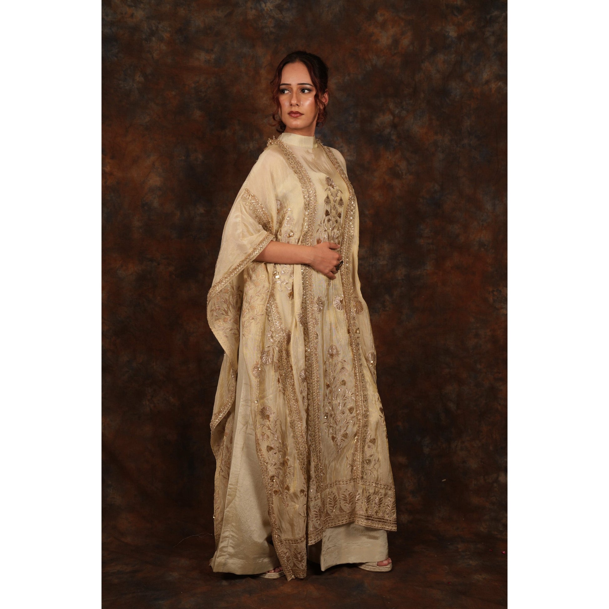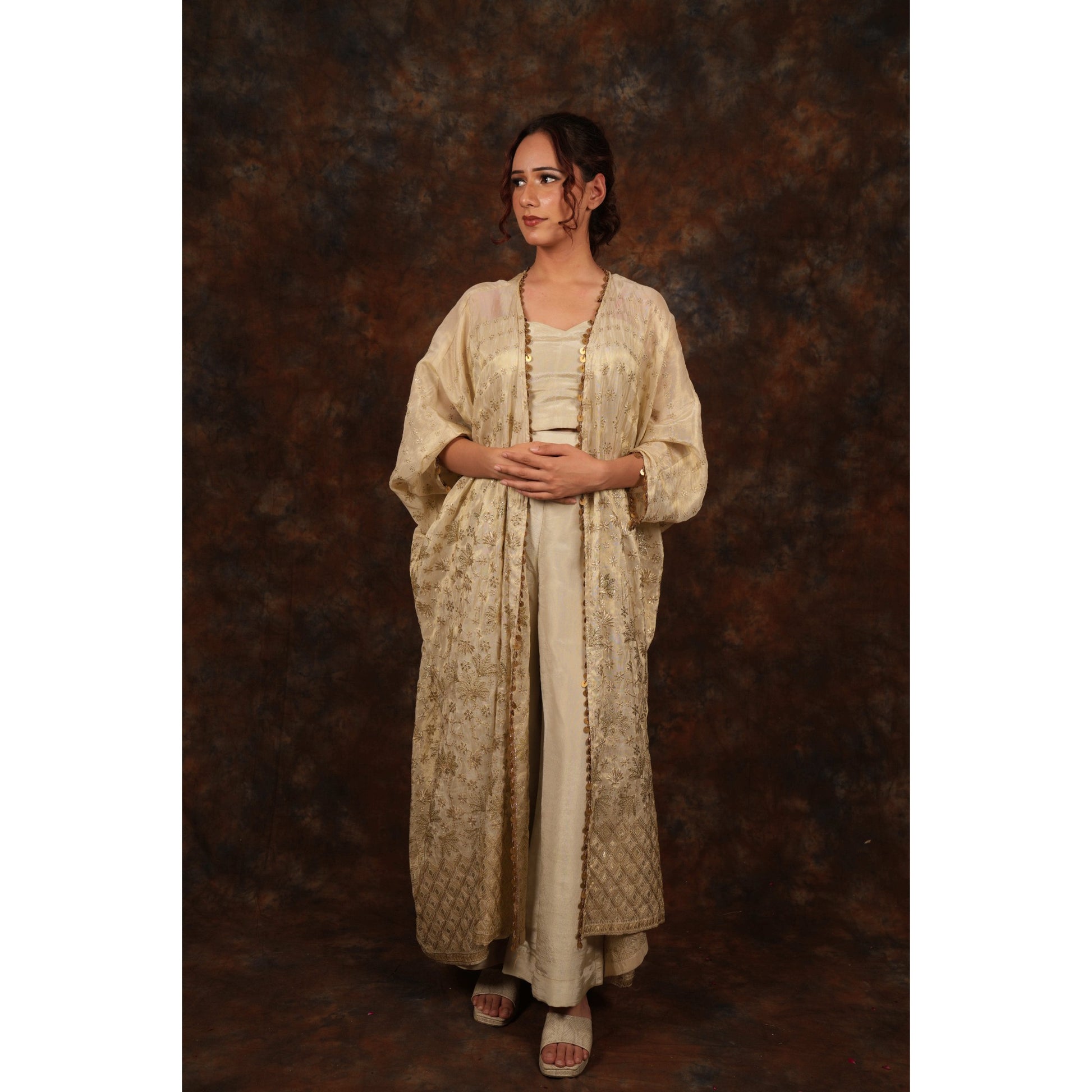 A long ivory kaftan teeming with exquisite, gilded embroidery.