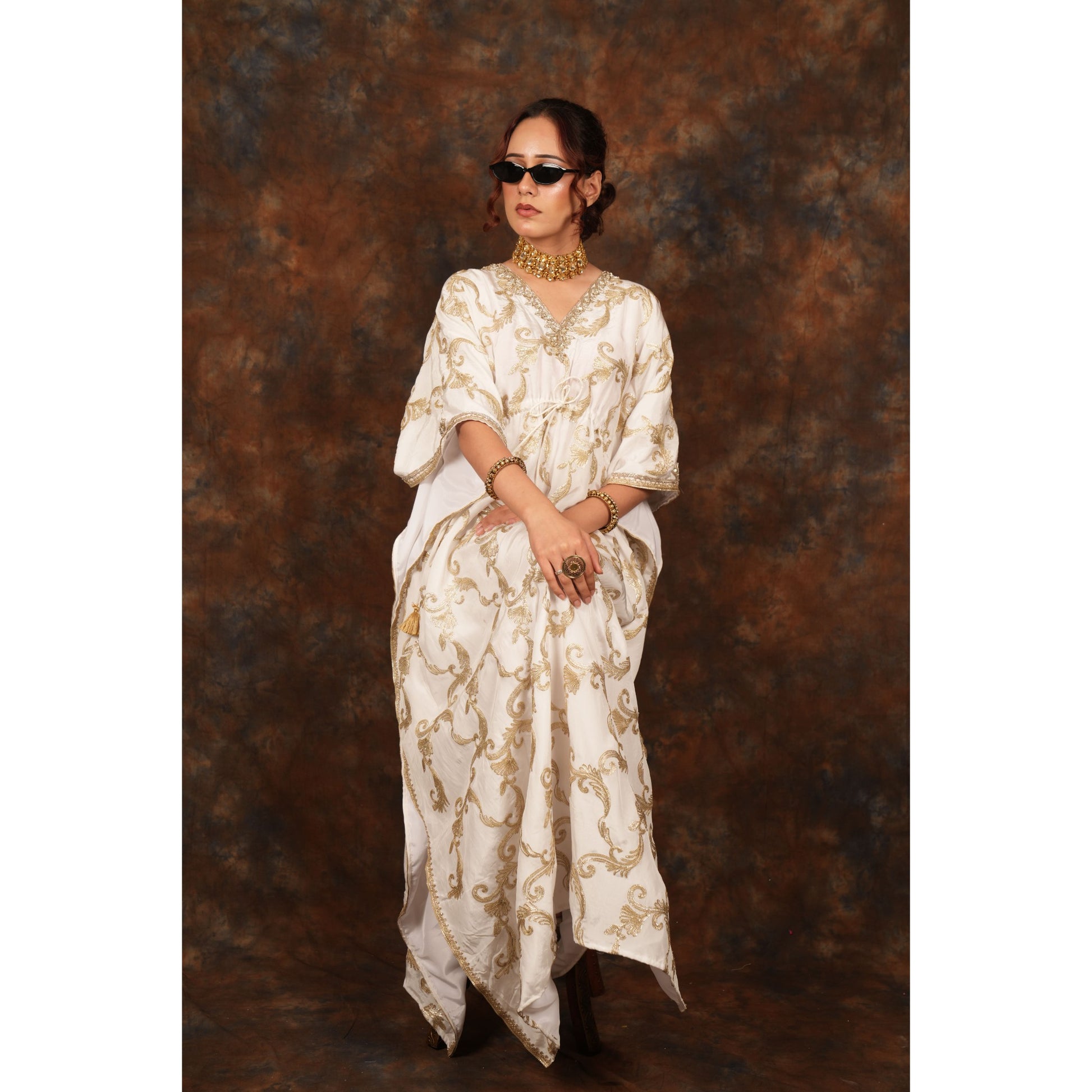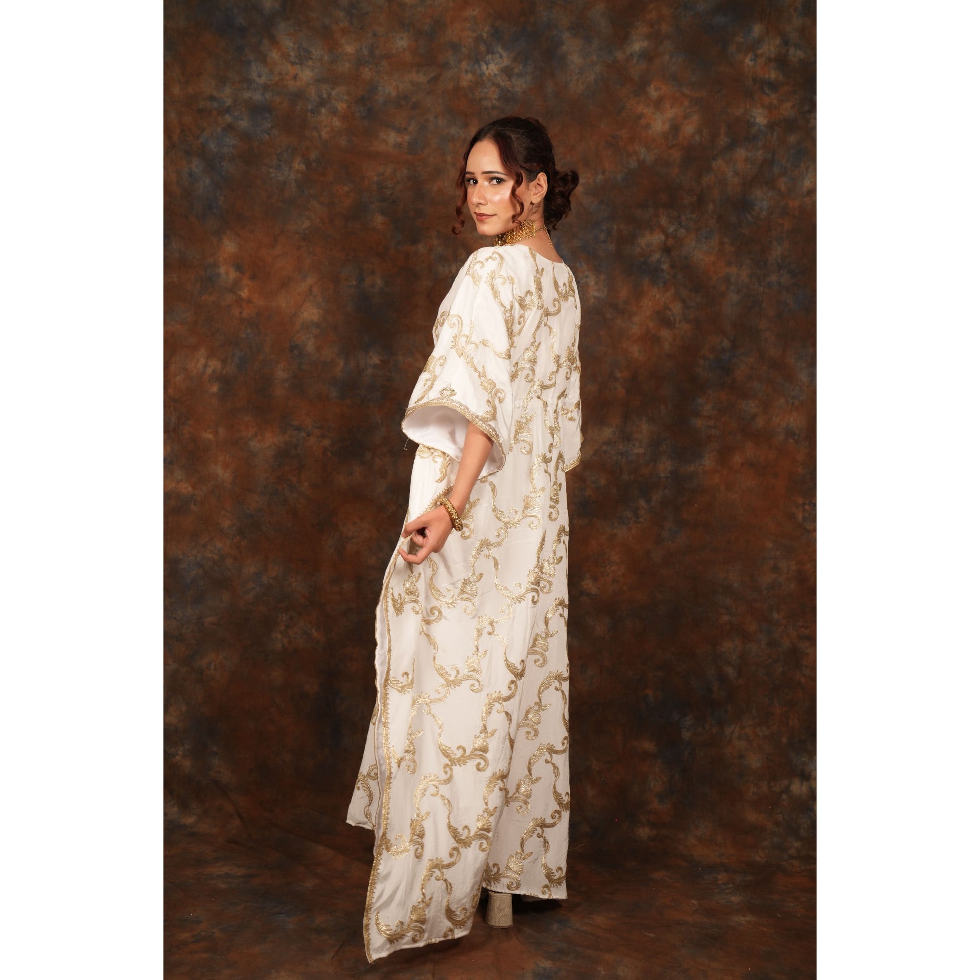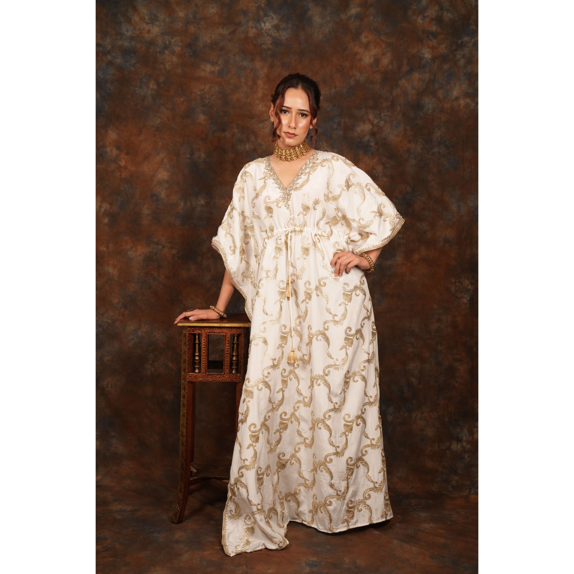 An ethereal ivory dress, adorned with golden embroidery and a gentle, luminous shimmer.